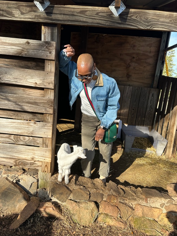 I was completely overdressed and absolutely unprepared to be holding animals who had been walking around in goat and chicken dookie moments earlier. 😂 But standing there, laughing and holding those goats, I felt lighter than I had in days.